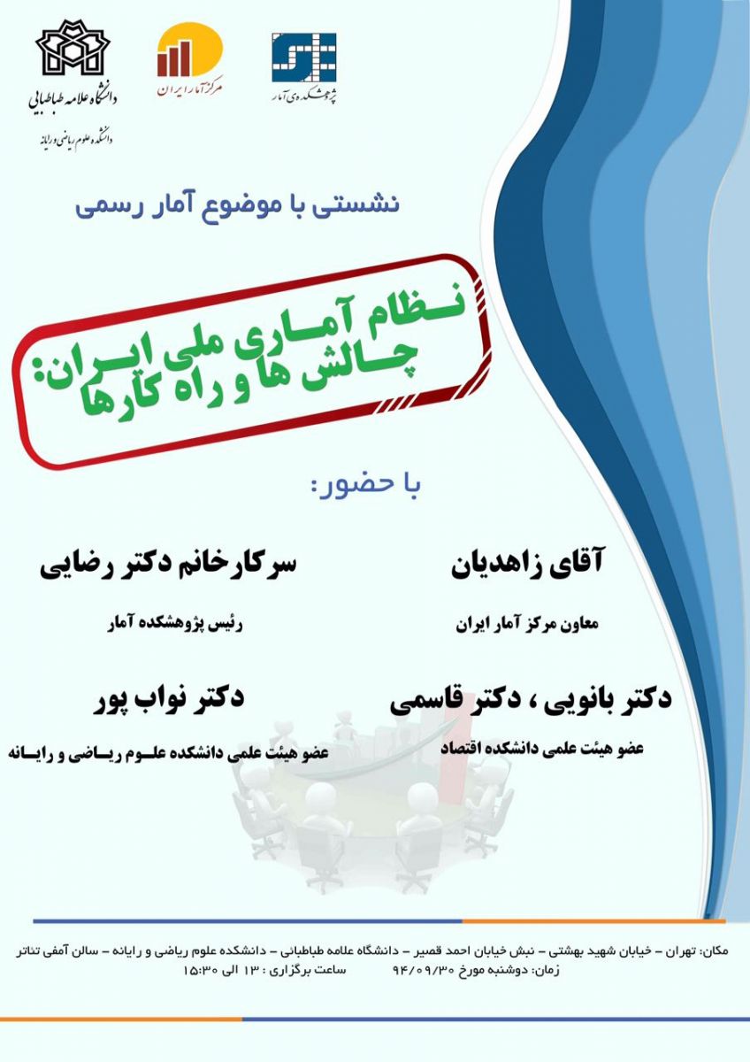 دانشکده علوم ریاضی و رایانه دانشگاه علامه طباطبایی با همکاری مرکز آمار ایران و پژوهشکدهی آمار نشستی با موضوع آمار رسمی: نظام آماری ملی ایران: چالشها و راهکارها در تاریخ ۳۰ آذرماه ۱۳۹۴ برگزار مینماید. شرکت در سخنرانیهای هفته پژوهش برای همه علاقهمندان آزاد و رایگان میباشد.