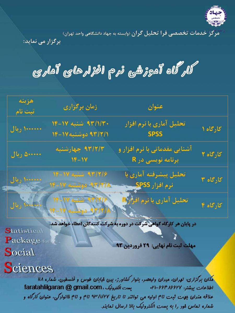 مرکز خدمات تخصصی فراتحلیلگران (وابسته به جهاد دانشگاهی واحد تهران)، ۴ کارگاه آموزشی در خصوص نرمافزارهای آماری برگزار خواهد کرد.
