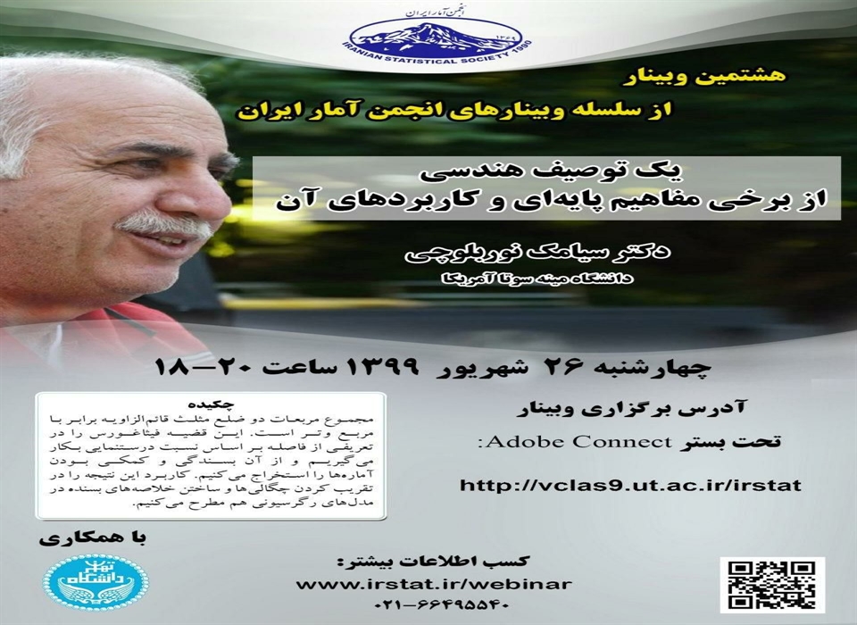 انجمن آمار با همکاری دانشگاه تهران هشتمین وبینار علمی و آموزشی خود را با عنوان «یک توصیف هندسی از برخی مفاهیم پایهای و کاربردهای آن» از ساعت ۱۸ الی ۲۰ روز چهارشنبه مورخ ۲۶ شهریور ۱۳۹۹ برگزار میکند.