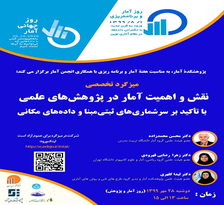 وبینار«نقش و اهمیت آمار در پژوهش های علمی با تاکید بر سرشماری های ثبتی مبنا و داده های مکانی» با سخنرانی دکتر محسن محمدزاده، عضو هیئت علمی دانشگاه تربیت مدرس، دکتر زهرا رضایی قهرودی، عضو هیئت علمی دانشگاه تهران و دکتر لیدا کلهری عضو هیئت علمی پژوهشکده آمار، به مناسبت روز آمار و پژوهش در هفته آمار و برنامه ریزی روز دوشنبه مورخ 28 مهر ماه 1399 از ساعت 13 الی 15 در پژوهشکده آمار برگزار می شود.