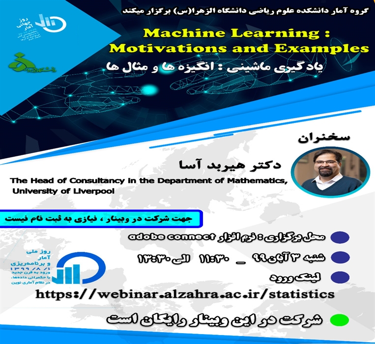 گروه آمار، دانشکده علوم ریاضی دانشگاه الزهرا وبیناری را با موضوع «یادگیری ماشینی: انگیزه ها و مثال ها» در روزشنبه 3 آبان ماه 1399 از ساعت 11:30 تا 13:30 برگزار می کند.