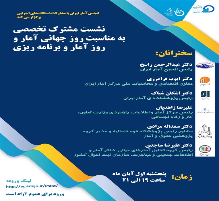 جناب آقای دکتر راسخ رئیس انجمن آمار ایران و عضو هیئت علمی دانشگاه شهید چمران اهواز ضمن تشکر ویژه از سازمانها و دستگاههای اجرایی در برگزاری مراسم هفته آمار به این نکته اشاره کردند که اگرچه ویروس کووید ۱۹ باعث شد تا نتوانیم مثل هر سال مراسم را بهصورت حضوری داشته باشیم اما حضور اساتید و دانشجویان سراسر کشور و همچنین مشارکت دستگاههای اجرایی در برگزاری این مراسم به صورت مجازی و اینترنتی قابل ستایش است و این فرصت فراهم شد تا به صورت راحتتر بتوانیم در مراسم روز آمار سایر دانشگاهها در نقاط مختلف کشور به صورت مجازی حضور یابیم.