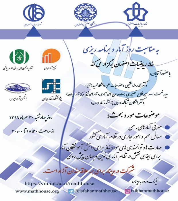 به مناسبت روز آمار و برنامه‌ریزی وبیناری به همت خانه ریاضیات اصفهان و با همکاری مرکز آمار ایران، پژوهشکده آمار و اتحادیه انجمن‌های ایرانی علوم ریاضی برگزار شد.