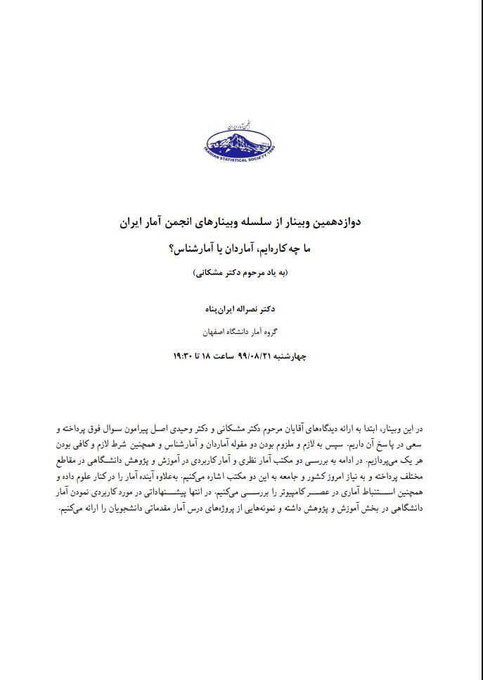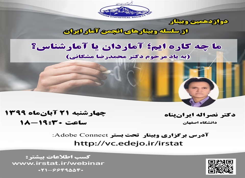 انجمن آمار دوازدهمین وبینار علمی و آموزشی خود را با عنوان «ما چه کاره ایم؛ آماردان یا آمارشناس؟» از ساعت 18 تا 19:30 روز چهارشنبه مورخ 21 آبان 1399 برگزار می کند.