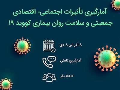 آمارگیری تأثیرات اجتماعی- اقتصادی، جمعیتی و سلامت روان بیماری کووید 19 از روز شنبه ۸ آذرماه ۱۳۹۹ آغاز میشود. این آمارگیری که در پی شیوع بیماری کووید ۱۹ در کشور طراحی شده است با نمونهای ۱۵ هزار خانواری در سطح کل کشور با انجام مصاحبههای تلفنی اجرا میشود. اجرای این آمارگیری تا یک ماه ادامه خواهد داشت و نتایج آن پس از پردازش دادههابا حفظ اصول محرمانگی داده ها ارائه خواهد شد. گزارش نهایی طرح شامل موضوعات ابتلا به بیماری و رفتارهای پیشگیرانه، آموزش کودکان و نوجوانان، ازدواج و فرزندآوری، وضع فعالیت و سلامت روان افراد در دوران همهگیری بیماری خواهد بود.