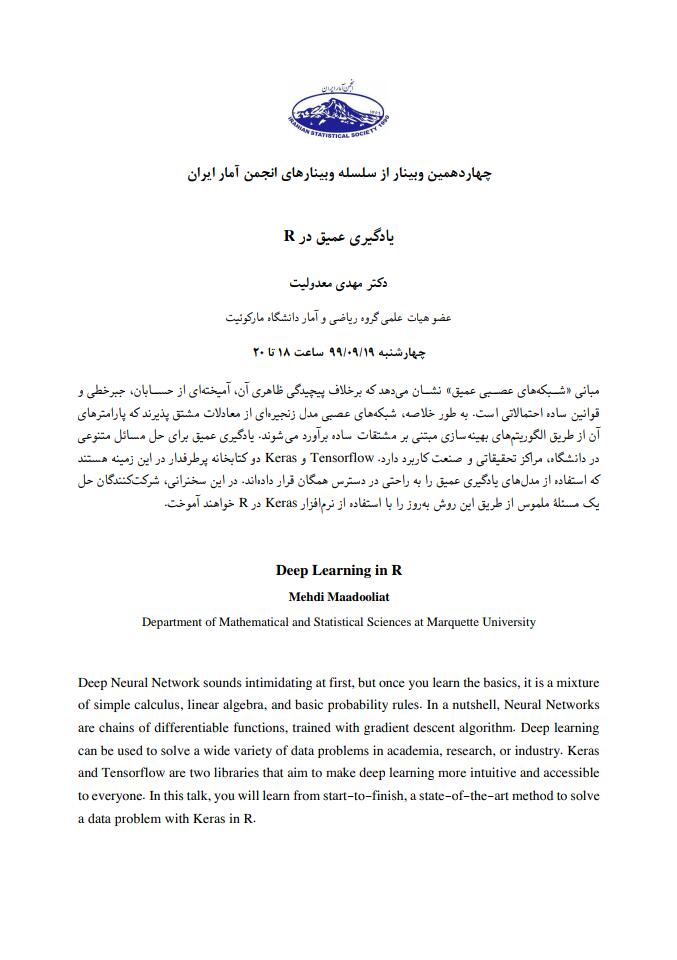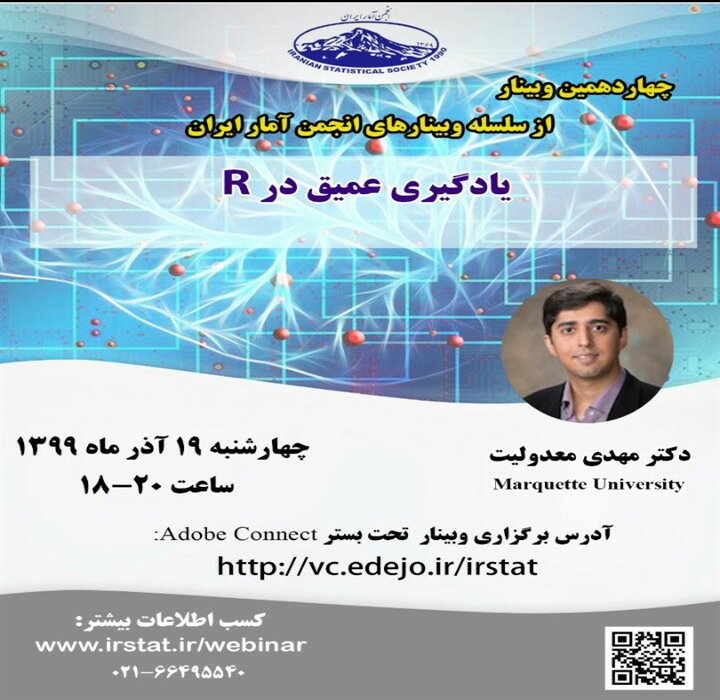 • چهاردهمین وبینار از سلسله وبینارهای انجمن آمار ایران با عنوان «یادگیری عمیق در R» برگزار می شود