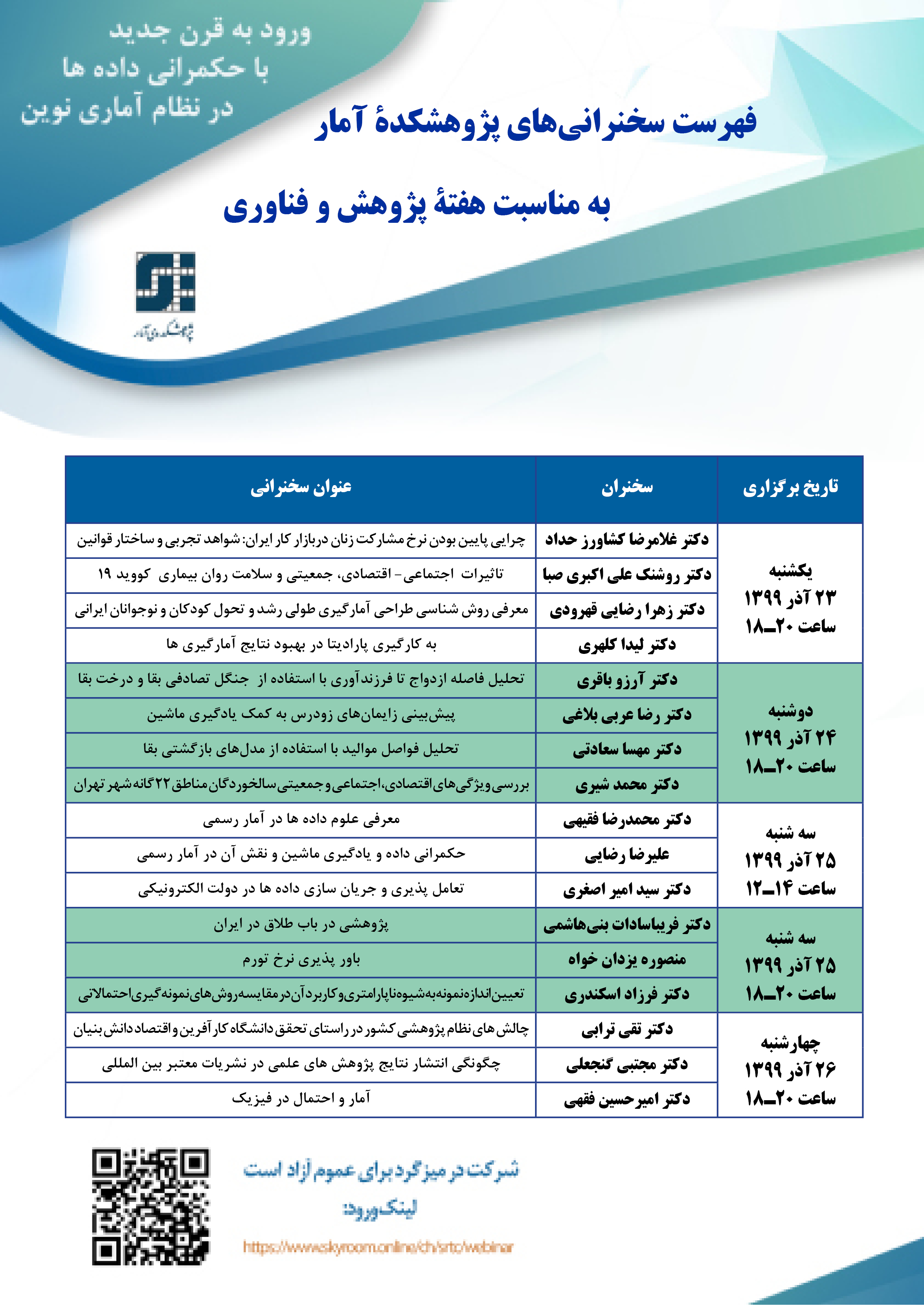 ٤-سه شنبه مورخ ٩٩/٩/٢٥: وبینار تخصصی با سخنرانی خانم ها دکتر فریبا سادات بنی هاشمی با عنوان«پژوهشی در باب طلاق در ایران»و منصوره یزدان خواه با عنوان «باورپذیری نرخ تورم» و آقای دکتر فرزاد اسکندری با عنوان «تعیین اندازه نمونه به شیوه ناپارامتری و کاربرد آن در مقایسه روش های نمونه گیری احتمالاتی» ازساعت ١٨ الی ٢٠