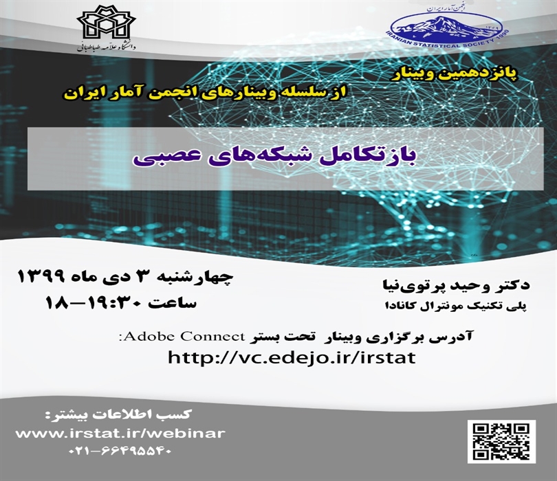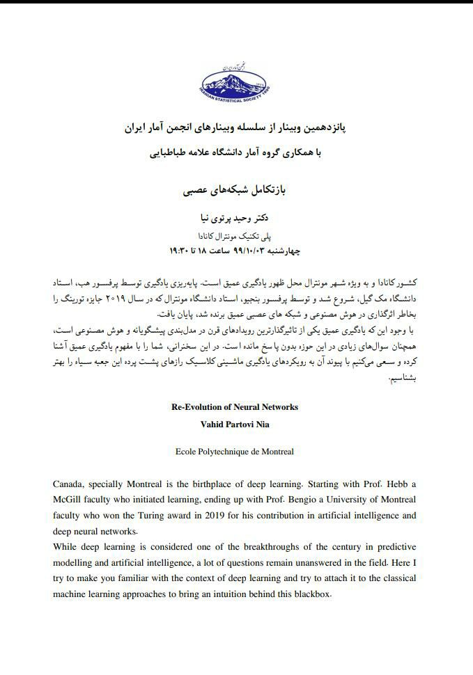 در این وبینار که توسط انجمن آمار ایران برگزار می شود، دکتر وحید پرتوی نیا از دانشگاه پلی تکنیک مونترال کانادا به موضوع «باز تکامل شبکه های عصبی» خواهد پرداخت.