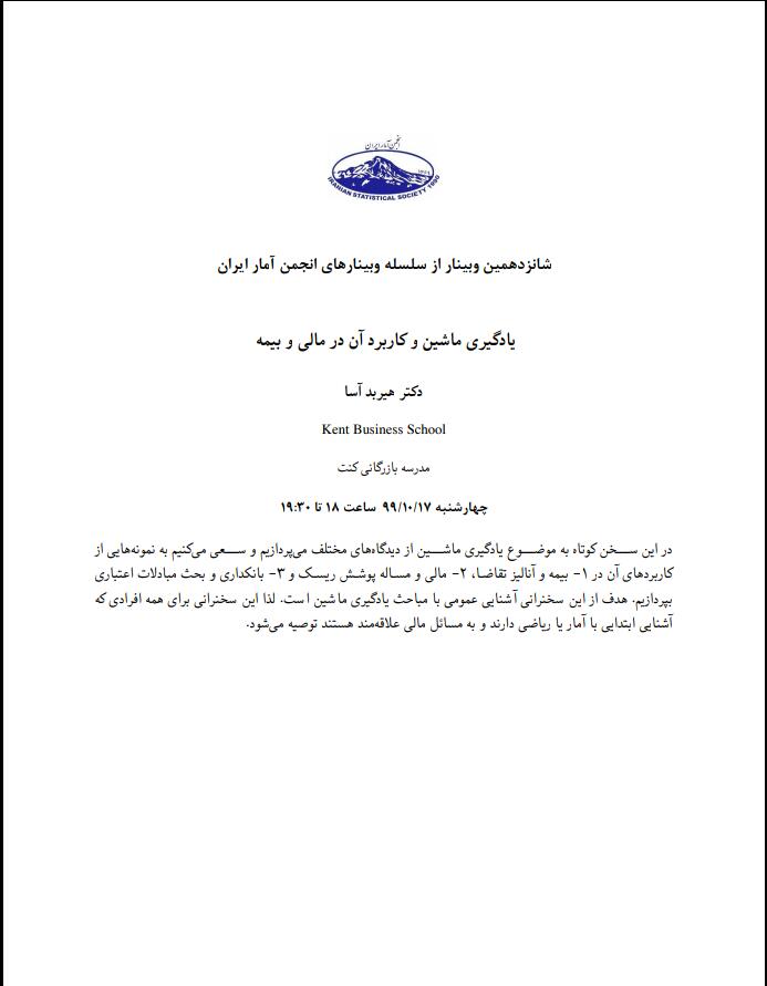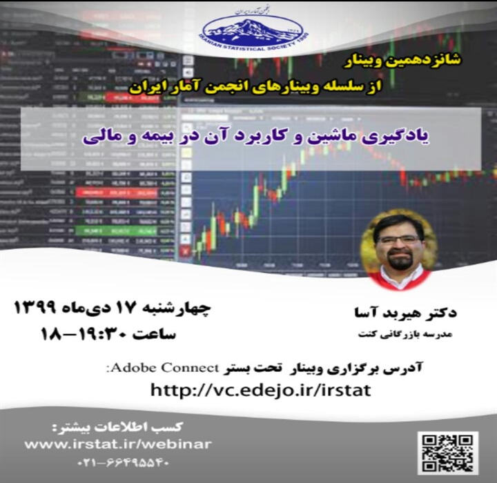 در این وبینار که توسط انجمن آمار ایران برگزار می شود، دکتر هیربد آسا از مدرسه بازرگانی کنت به موضوع "یادگیری ماشین و کاربرد آن در بیمه و مالی" خواهد پرداخت.