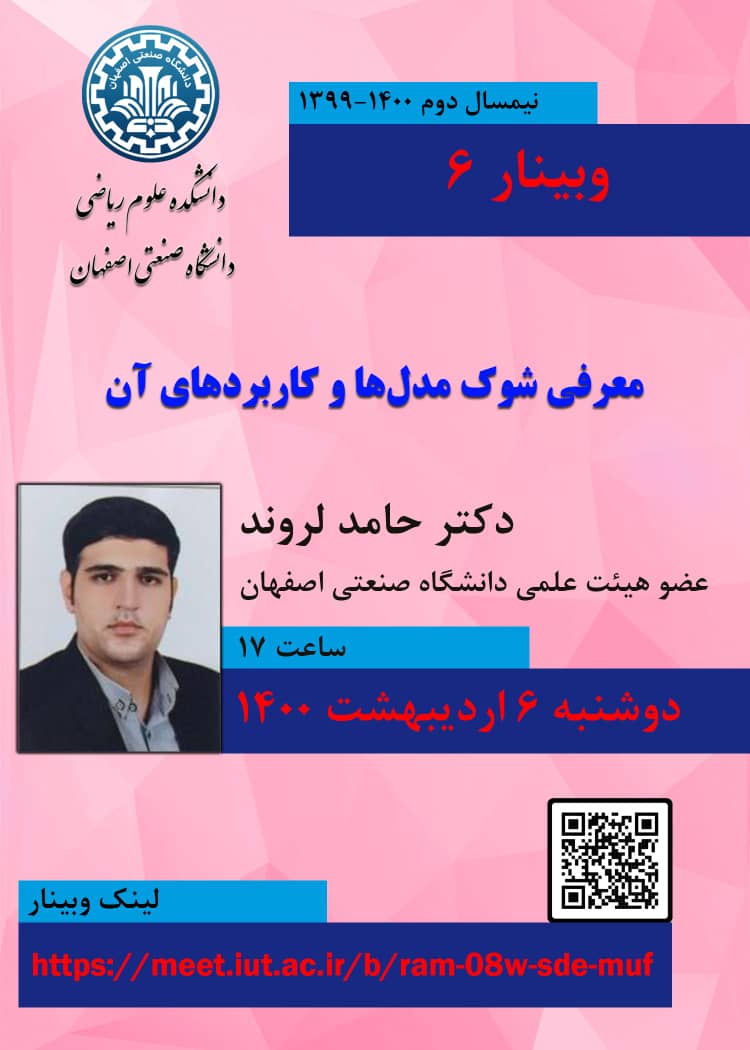 در این وبینار که توسط دانشکده علوم ریاضی دانشگاه صنعتی اصفهان برگزار می‌شود، دکتر حامد لروند، عضو هیئت علمی دانشگاه صنعتی اصفهان، به موضوع «شوک‌مدل‌ها و کاربردهای آن» خواهد پرداخت.