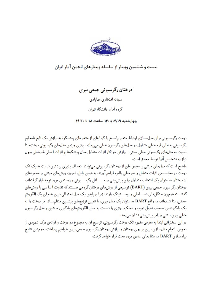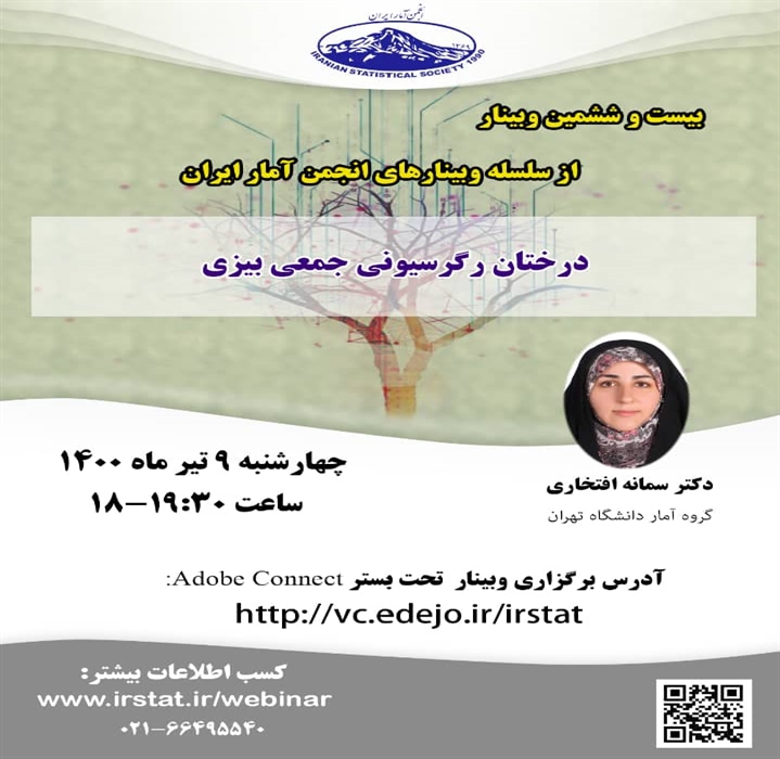 در این وبینار که توسط انجمن آمار برگزار می شود، دکتر سمانه افتخاری به موضوع "درختان رگرسیونی جمعی بیزی" خواهد پرداخت.