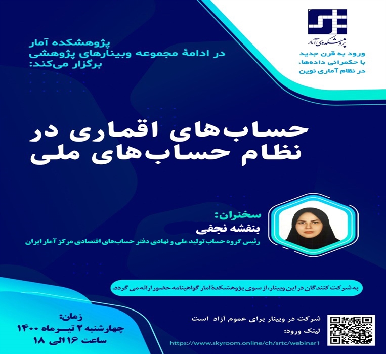 در ادامه برگزاری سلسله جلسات علمی-تخصصی، پژوهشکده آمار وبینار "حساب های اقماری در نظام حساب های ملی" را از ساعت 18 تا 16 روز چهارشنبه 2 تیر 1400 با سخنرانی خانم بنفشه نجفی (رییس گروه تولید ملی و نهادی دفتر حساب های اقتصادی مرکز آمار ایران) برگزار شد.