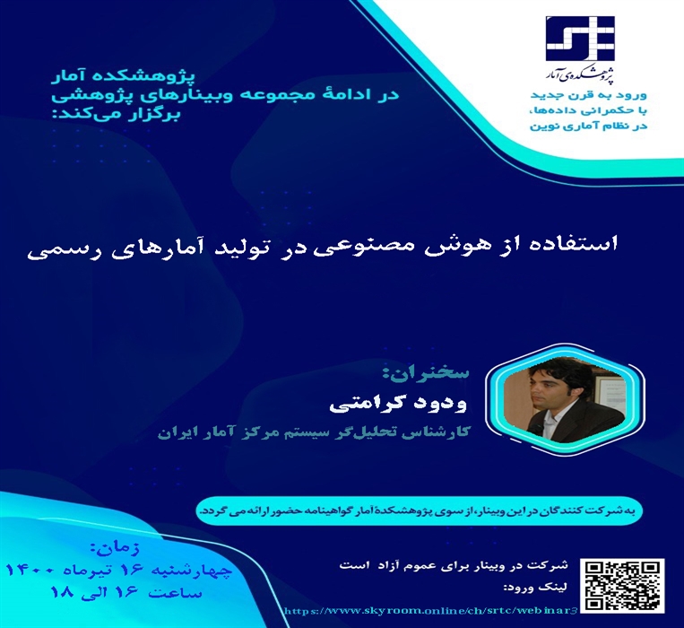 درادامه برگزاری سلسله جلسات علمی – تخصصی، پژوهشکده آمار وبینار "هوش مصنوعی در تولید آمارهای رسمی" از ساعت 18 تا 16 روز چهارشنبه 16 تیر 1400 با سخنرانی آقای ودود کرامتی )کارشناس تحلیلگرسیستم مرکز آمار ایران) برگزار شد.