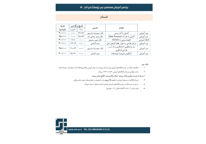 آموزشهای تخصصی پژوهشکدۀ آمار از تاریخ 24 مردادماه 1400 آغاز خواهد شد و علاقهمندان، میتوانند جهت آشنایی، ثبت نام در این کلاسها و یا کسب اطلاعات بیشتر، با شماره تلفنهای ۳-۸۸۶۳۰۴۴۰ داخلی (۱۱۱) سرکار خانم شهبازی تماس حاصل فرمایید.