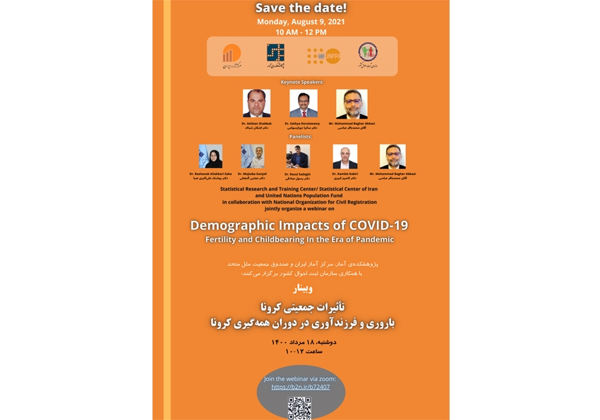وبینار علمی-تخصصی "تاثیرات جمعیتی کرونا باروری و فرزندآوری در دوران همهگیری کرونا" از ساعت 12-10 روز دوشنبه 18 مرداد ماه 1400 با حضور و سخنرانی: