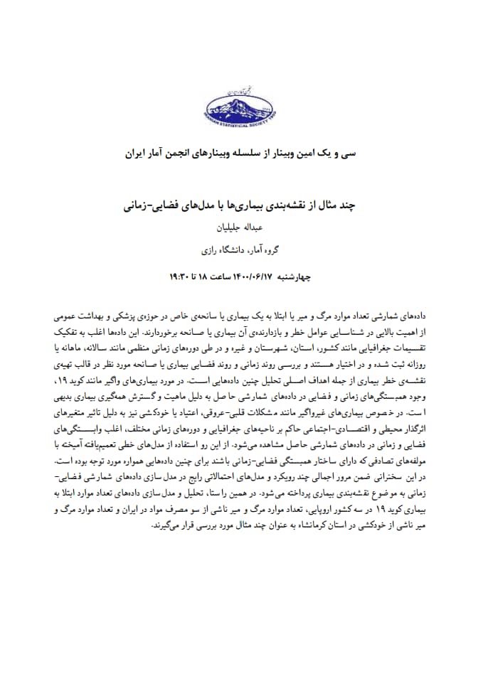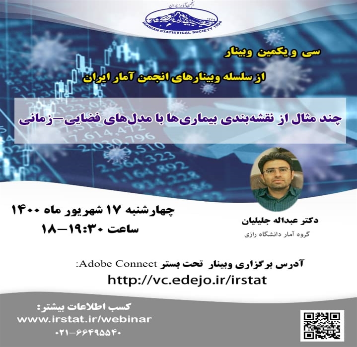 در این وبینار که توسط انجمن آمار برگزار می شود، دکتر عبداله جلیلیان به موضوع "چند مثال از نقشهبندی بیماریها با مدلهای فضایی - زمانی" خواهد پرداخت.