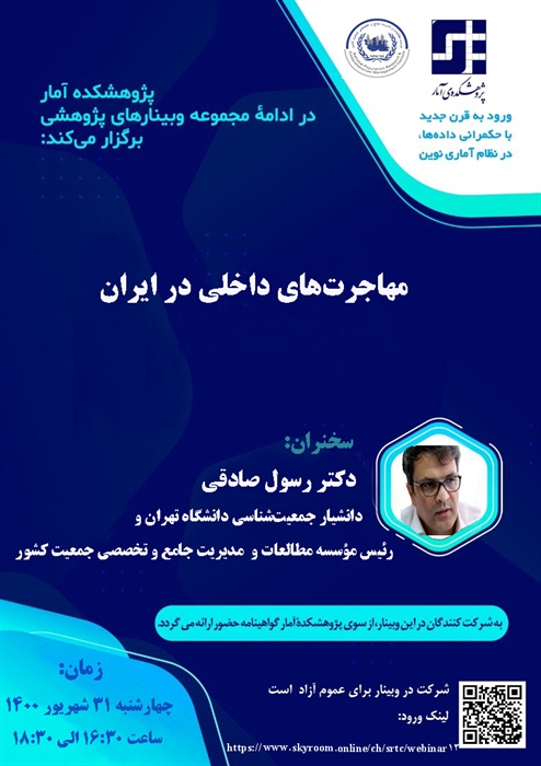 در ادامه برگزاری سلسله جلسات علمی – تخصصی، پژوهشکده آمار وبینار "مهاجرت های داخلی در ایران" از ساعت 16:30 الی 18:30 روز چهارشنبه 31 شهریور ماه 1400 با سخنرانی دکتر رسول صادقی دانشیار جمعیت شناسی دانشگاه تهران و رییس موسسه مطالعات و مدیریت جامع و تخصصی جمعیت کشور برگزار شد.