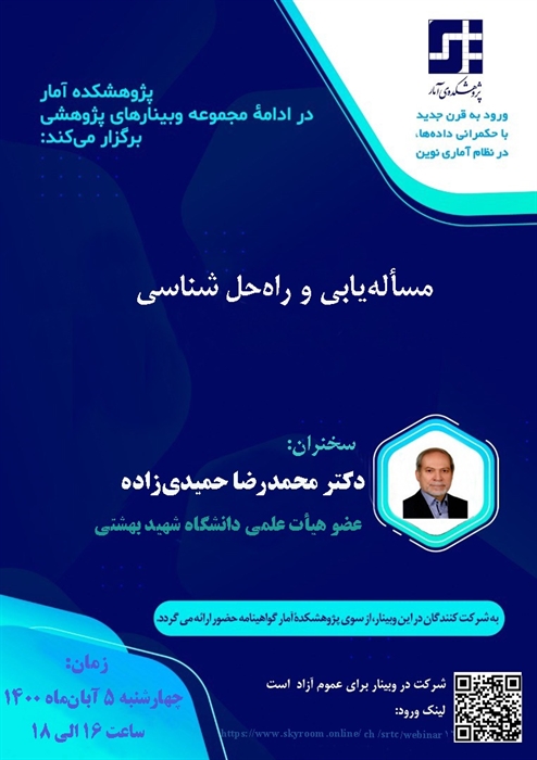 در ادامه برگزاری سلسله جلسات علمی-تخصصی، پژوهشکده آمار وبینار "مسالهیابی و راه حلشناسی" از ساعت 16 الی 18 روز چهارشنبه 5 آبانماه 1400 با سخنرانی دکتر محمدرضا حمیدیزاده؛ عضو هیات علمی دانشگاه شهید بهشتی برگزار شد.