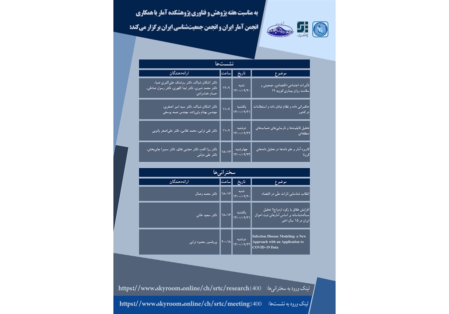 پژوهشکده آمار با همکاری انجمن آمار و انجمن جمعیت‌شناسی مجموعه سخنرانی‌ها و نشست‌هایی را به مناسبت هفته پژوهش و فناوری برگزار می‌کند