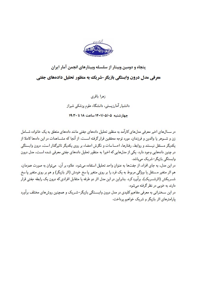 وبینار علمی _ تخصصی «معرفی مدل درون وابستگی بازیگر-شریک به منظور تحلیل داده های جفتی»