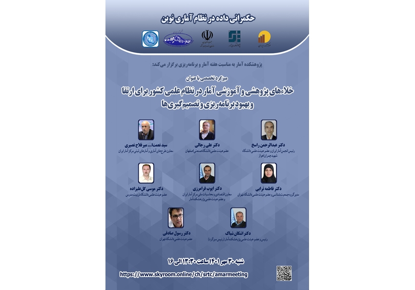 میزگرد تخصصی با عنوان خلاءهای پژوهشی و آموزشی آمار در نظام علمی کشور برای ارتقا و بهبود برنامهریزی و تصمیمگیریها، شنبه ۳۰ مهر ۱۴۰۱ ساعت ۱۳:۳۰ الی ۱۶