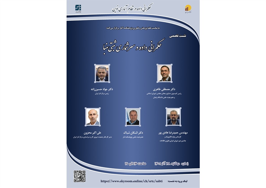 به مناسبت هفته پژوهش و فناوری، پژوهشکده آمار روز دوشنبه مورخ 1401/9/28 میزگرد تخصصی «حکمرانی داده و سرشماری ثبتیمبنا» را برگزار مینماید.