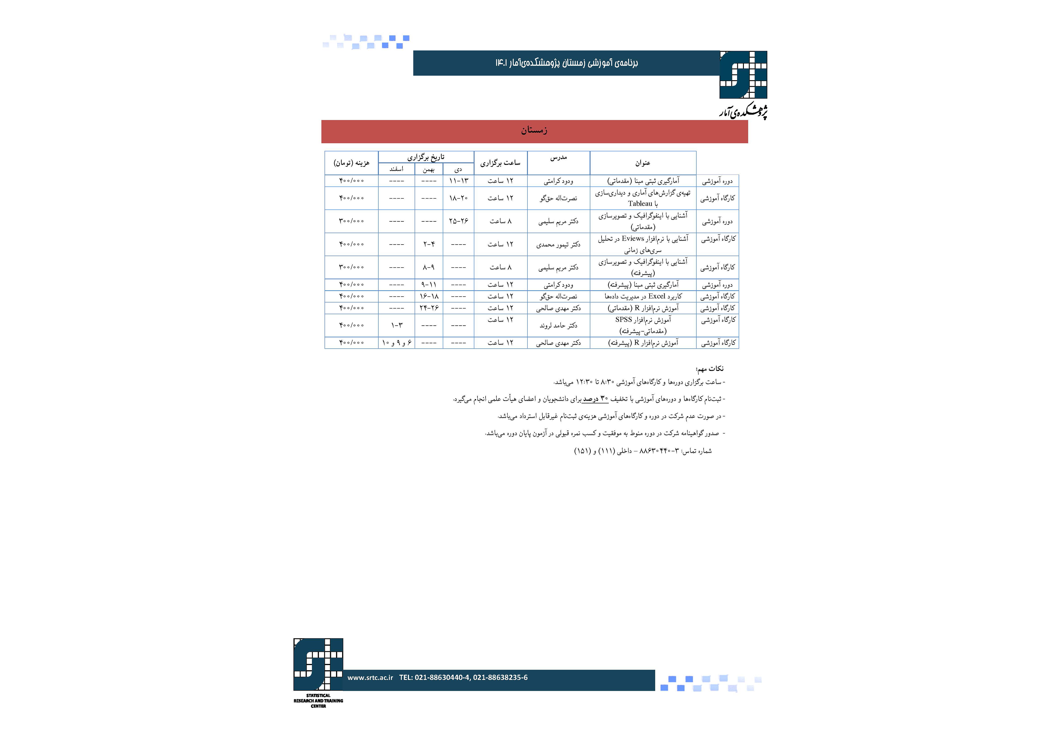 آموزشهای تخصصی پژوهشکدۀ آمار از تاریخ 11 دیماه 1401 آغاز خواهد شد و علاقهمندان، میتوانند جهت آشنایی، ثبت نام در این کلاسها و یا کسب اطلاعات بیشتر، با شماره تلفنهای 3-88630440داخلی (111و151) سرکار خانم شهبازی و ناظریان تماس حاصل فرمایید.