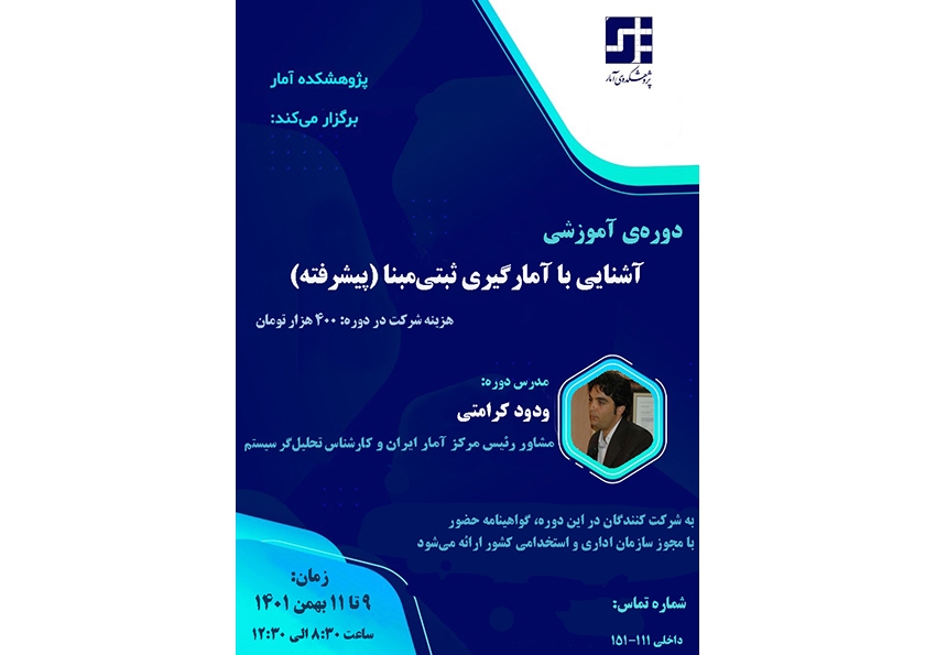 • پژوهشکده آمار دوره‌ی آموزشی "آشنایی با آمارگیری ثبتی‌مبنا (پیشرفته)" را برگزار می‌کند