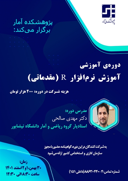 دورهی آموزشی «آموزش نرمافزار R (مقدماتی)» بهمدت 12 ساعت در تاریخ 30 بهمن تا 2 اسفندماه توسط آقای دکتر سیدمهدی صالحی، عضو هیئت علمی دانشگاه نیشابور برگزار شد.