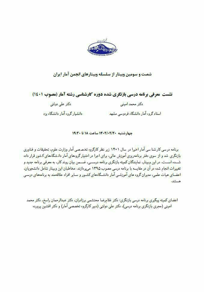 وبینار علمی _ تخصصی «نشست معرفی برنامه درسی بازنگری شده دوره کارشناسی رشته آمار (مصوب ۱۴۰۱)»