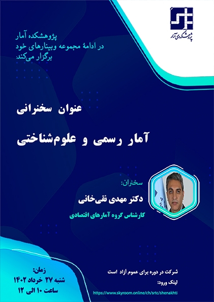 وبینار "آمار رسمی و علومشناختی" بهمدت ۲ ساعت در تاریخ ۲۷ خرداد ۱۴۰۲ توسط آقای دکتر مهدی نقیخانی، کارشناس گروه آمارهای اقتصادی؛ بهصورت مجازی برگزار شد.