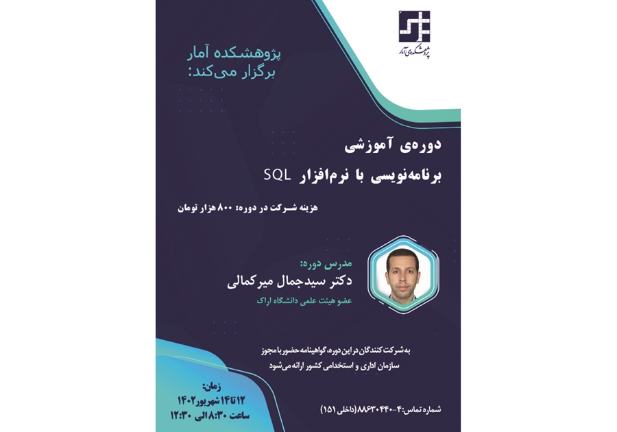 • پژوهشکده آمار دوره‌ی آموزشی «برنامه‌نویسی با نرم‌افزار SQL» را برگزار می‌کند
