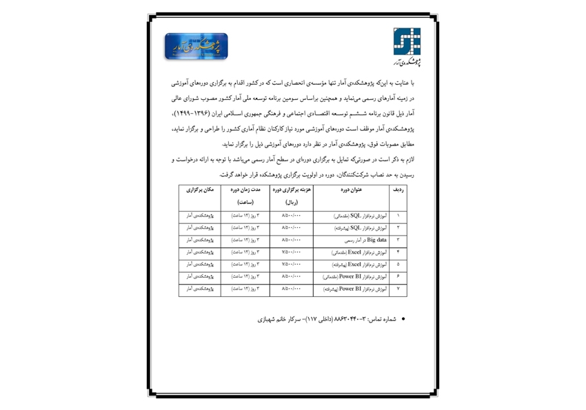 با عنایت به این‌که پژوهشکده‌ی آمار تنها مؤسسه‌ی انحصاری است که در کشور اقدام به برگزاری دوره‌های آموزشی در زمینه آمارهای رسمی می‌نماید و همچنین براساس سومین برنامه توسعه ملی آمار کشور مصوب شورای عالی آمار ذیل قانون برنامه ششم توسعه اقتصادی اجتماعی و فرهنگی جمهوری اسلامی ایران (۱۴۹۹-۱۳۹۶)، پژوهشکده‌ی آمار موظف است دوره‌های آموزشی مورد نیاز کارکنان نظام آماری کشور را طراحی و برگزار نماید، مطابق مصوبات فوق، پژوهشکده‌ی آمار در نظر دارد دوره‌های آموزشی ذیل را برگزار نماید. خواهشمند است دستور فرمائید جهت هماهنگی و ثبت داوطلبان آموزشی آن مجموعه محترم، فهرست همکاران و دانشجویان علاقه‌مند به شرکت در دوره‌ها را حداکثر تا تاریخ ۱۴۰۳/۰۹/۰۵ به پژوهشکده‌ی آمار اعلام شود. همچنین برنامه زمانی برگزاری دوره‌ها و اطلاعات تکمیلی آن‌ها متعاقباً اعلام خواهد شد.