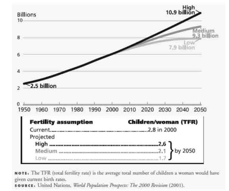 مرگ و میر پیشرفتهای مداوم در بهداشت و مراقبتهای بهداشتی در سراسر جهان، سازمان ملل را بر آن داشته تا مفروضات خود در مورد محدودیتهای نهایی امید زندگی را هر بار در پیشبینیهای جمعیتی جدید که تولید میکند، افزایش دهد. هر بار جمعیتشناسان براورد پایینتری از افزایش امید زندگی داشتند. در حالی که این کمبراوردی از امید زندگی روی همرفته تأثیر اندکی بر کل جمعیت داشت، آنها اندازهی جمعیت سالخورده، و در نتیجه، چالشهای رو به رشد جمعیت سالمند برای بازنشستگی و برنامههای تأمین اجتماعی را نادیده میگرفتند. اپیدمی اچ آی وی/ایدز یک بحران جمعیتشناختی غیر منتظره است: این اپیدمی امید زندگی پیشبینیشده برای جنوب صحرای آفریقا، بهخصوص، جایی که میزان عفونت بیش از 2 درصد از جمعیت 45 کشور است؛ را کاهش داده است. در 9 کشور که بیشتر تحت تأثیر قرار گرفته بودند (بیشتر در شرق و جنوب آفریقا)، براوردهای اخیر سازمان ملل نشان میدهد که مرگ و میر ناشی از ایدز تقریباً 18 درصد جمعیت پیشبینیشده در سال 2015 را در مقایسه با آنچه بدون ایدز بوده، کاهش میدهد. اگر میزانهای فوقالعاده بالایی از عفونت در تعداد کمی از کشورها وجود داشته باشد، اچ آی وی/ ایدز تأثیر متوسطی روی رشد جمعیت در آفریقا خواهد داشت. اما اگر شیوع اچ آی وی/ ایدز در سایر مناطق جنوب صحرای آفریقا، همچنین در آسیا و اروپای شرقی به همان میزان بالا باشد، اچ آی وی/ ایدز میتواند امید زندگی در این مناطق را کاهش دهد و بر رشد جمعیت جهان تأثیر بگذارد. مهاجرت آیندهی مهاجرت بینالمللی برای پیشبینی نسبت به باروری و مرگ و میر دشوارتر است زیرا جریانهای مهاجرت اغلب ناشی از تغییرات کوتاهمدت در عوامل اقتصادی، اجتماعی یا سیاسی است که پیشبینی یا کمیسازی آنها دشوار است. مهاجرت میتواند تأثیر معنیداری بر تغییر جمعیت در مناطق و کشورهای خاص داشته باشد: بهعنوان مثال، مهاجرت بینالمللی تقریباً نیمی از نرخ رشد جمعیت در کشورهای پیشرفتهتر در دههی 1990 را تشکیل میدهد. جریانهای آوارگان به دنبال ناآرامیهای مدنی و سیاسی منجر به تغییر وضعیت جمعیتی در برخی از کشورهای کمترتوسعهیافته شده است. هیچ روشی برای پیشبینی مهاجرتهای ناگهانی انبوه ناشی از بحرانهای سیاسی، اقتصادی یا محیطی وجود ندارد. بهترین جمعیتشناسان میتوانند براوردهای خود را به محض دسترسی به اطلاعات جدید بازنگری کنند. روندهای پیشبینی شده به چه چیزی اشاره دارد؟ تغییرات اجتماعی، اقتصادی و زیستمحیطی، همراه با سیاستهای دولت، میتواند روندهای جمعیتشناختی آینده- به ویژه سطوح باروری- که برخی تردیدها در پیشبینیهای جمعیت را تضمین میکند؛ تحت تأثیر قرار دهد. به دلیل تأثیرات پیچیده سطوح باروری گذشته بر ساختار سنی جمعیت، و تردید ذاتی در روندهای آیندهی پیشبینی، سناریوهای بلندمدت از مؤسسات مختلف، طیف گستردهای را در بر میگیرد. با این وجود، برخی از شباهتها بین پیشبینیهای مرکزی یا »محتمل« و بین محدودههای قابل قبول از اندازهی جمعیت پیشبینیشده توسط نهادهای مختلف وجود دارد. ادارهی سرشماری ایالات متحده جمعیت جهان را برای سال2050، ۹٫۱ میلیارد نفر، با ۹٫۳ میلیارد برای آخرین پیشبینی متوسط سازمان ملل، و ۸٫۷ میلیارد برای بانک جهانی و ۸٫۸ میلیارد از مؤسسه بینالمللی تجزیه و تحلیل سیستمهای کاربردی (IIASA) مقایسه کرده است. تا سال 2100، تفاوتها در براوردهای مرکزی از این مؤسسات، به یک میلیارد یا بیشتر، و تفاوتها بین دامنهی سناریوهای بالا و پایین بیشتر از 10 میلیارد- از 4 تا 16 میلیارد افزایش داشته است. از جمله موارد دیگر که اعضای آکادمی ملی علوم (NAS)، توصیه میکنند این که جمعیتشناسان روشهای جدیدی برای توصیف عدم قطعیت مرتبط با هر پیشبینی جمعیت ایجاد کنند: جمعیتشناسان باید این احتمال که جمعیت آیندهی جهان، برای مثال، بین 10 تا 12 میلیارد نفر باشد را بیان کنند. این اصلاحات روششناختی، همراه با بهبود مستمر در مفروضات استفادهشده برای ایجاد پیشبینیها، پیشبینیها را برای طیف وسیعی از کاربران