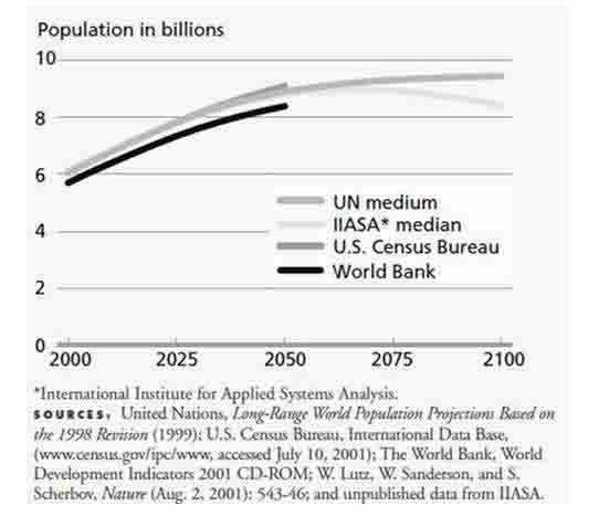 شکل 1- پیشبینیهای جمعیت جهان برای سال 2050 و 2100: سازمان ملل، بانک جهانی، دفتر سرشماری ایالات متحده ومؤسسه بینالمللی تجزیه و تحلیل سیستمهای کاربردی (IIASA)