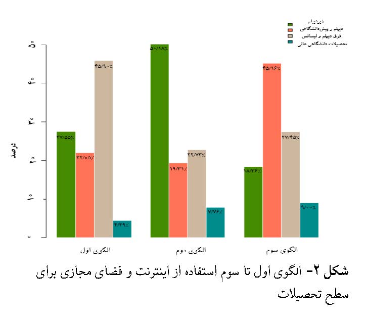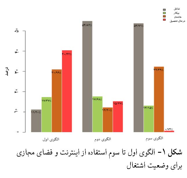 با اجرای خوشهبندی k -نمونه اولیه با تعداد خوشه 3 (تعداد خوشه با روش اعتبارسنجی متقابل حاصل شده است) روی دادههای گذران وقت و فضای مجازی استخراج شده از دادههای طرح گذران وقت مرکز آمار ایران برای سال 1399 الگوهای حاصل از نتایج خوشهبندی را به طور کلی میتوان به سه الگوی زیر بیان کرد (هر الگو بر اساس بیشترین درصدهای استفاده از اینترنت و فضای مجازی ساخته شده است برای نمونه با توجه به شکل1و2 در الگوی اول سطح تحصیلات فوق دیپلم و لیسانس و وضعیت اشتغال در حال تحصیل بیشترین درصد استفاده از اینترنت و فضای مجازی را دارد برای این منظور به عنوان ویژگیهای الگوی اول آورده شدهاند، سایر الگوها نیز به همین صورت ساخته شدهاند. لازم به ذکر است امکانات رفاهی شامل موارد خودرو شخصی، موتورسیکلت، دوچرخه، رادیو، تلویزیون، انواع ویدیو، انواع رایانه و تبلت، تلفن همراه، تلفن ثابت، یخچال، فریزر و ... هستند که بر اساس تعداد امکانات رفاهی در اختیار خانوار به سه رده کم، متوسط و زیاد تقسیم شد):