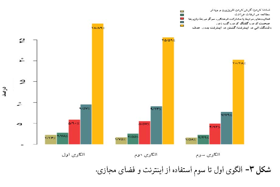 با توجه به سه الگوی استفاده از اینترنت و فضای مجازی به دست آمده، نتایج زیر را میتوان استخراج نمود (در تحلیل نتایج در هر الگو یک سری ردههای ایدهآل از هر ویژگی یا متغیر بر اساس بیشترین درصدها به عنوان ملاک برای مقایسه الگوهای مختلف در نظر گرفته شده است؛ مدت زمان استفاده از اینترنت و فضای مجازی به منظور انجام هر یک از فعالیتهای وقتگذرانی در اینترنت به عبارتی گشتن در اینترنت بدون هدف؛ صحبت کردن/ گفتگو کردن و گپ زدن؛ مشارکتهای فرهنگی، سرگرمی و بازیها؛ مطالعه در اوقات فراغت؛ تماشاکردن/ گوش کردن تلویزیون و ویدئو به سه رده کم، متوسط و زیاد تقسیم شد، سپس برای هر الگو به صورت جداگانه درصد استفاده از اینترنت و فضای مجازی محاسبه شد و نهایتاً رده مصرف زیاد جهت مقایسه الگوهای ذکرشده در نظر گرفته شد (شکل3)):
